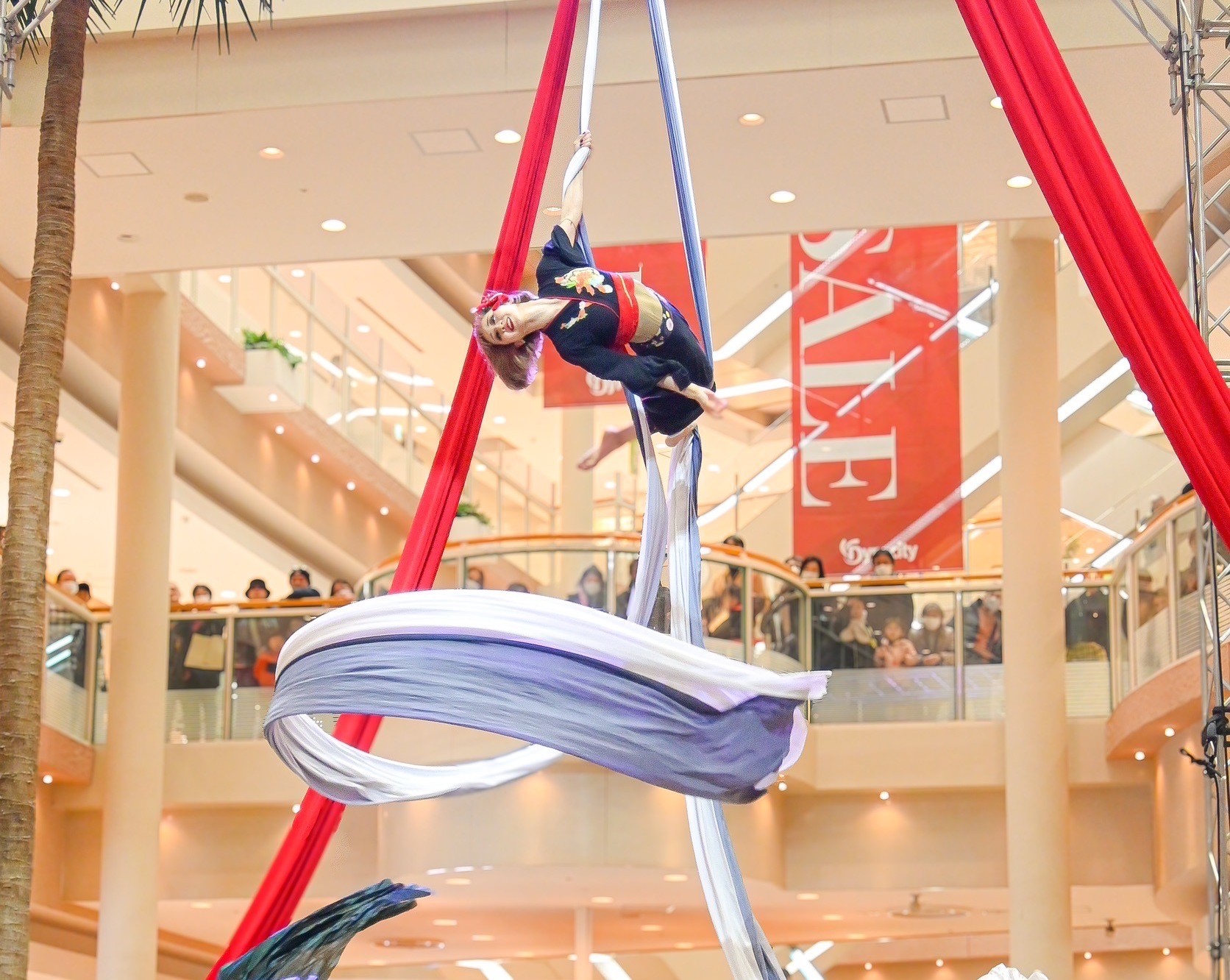 エアリアルアートの中でも最も幻想的と呼ばれるティシュー(布)をトラスの四方に吊り下げパフォーマーが達の華麗な舞。