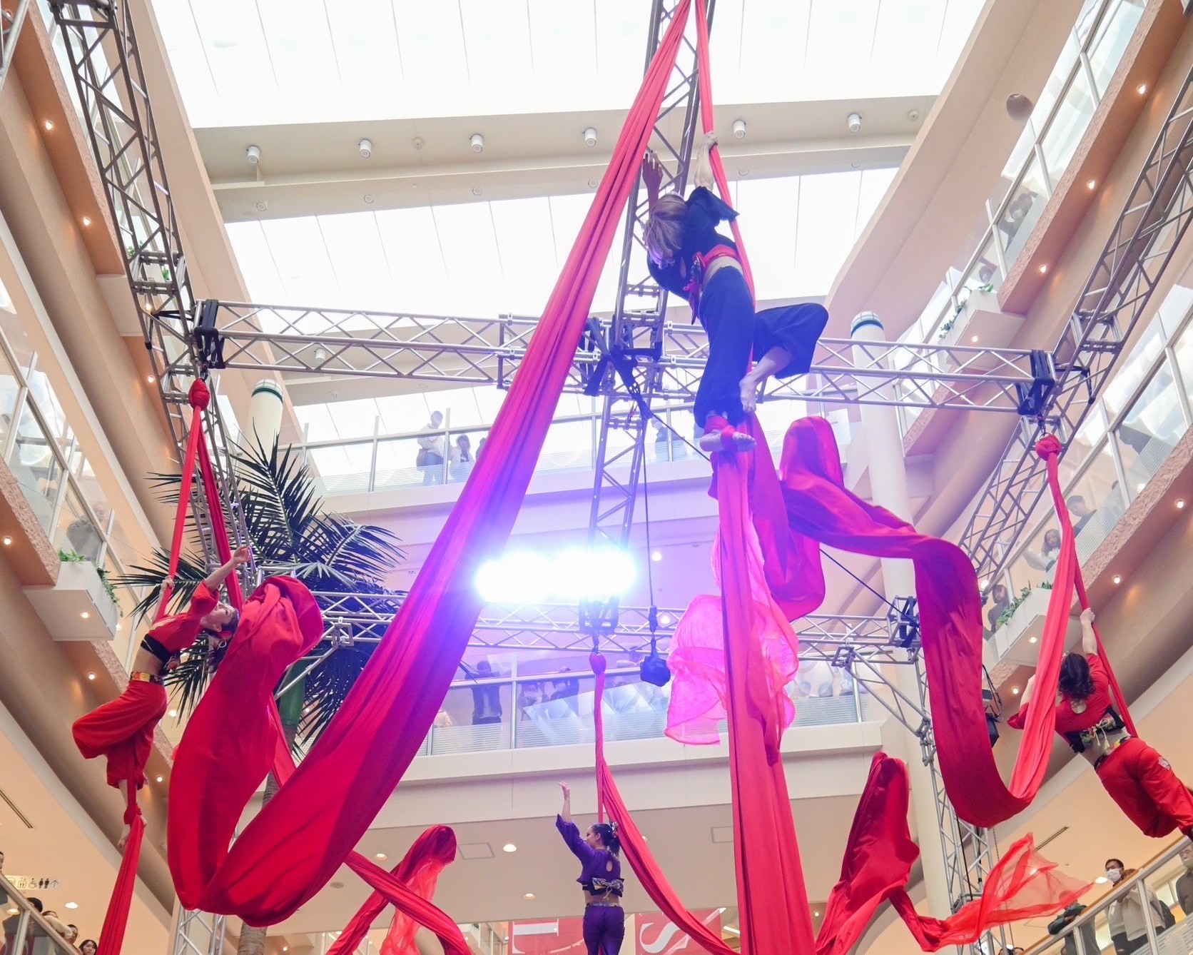 通常は劇場でしか見ることができない高さを生かしたパフォーマンスをオリジナルのトラスステージを組み上げることで、吹き抜けスペースの有る商業空間でも実施を可能とする。地上から2F・3Fまで360度から観覧できるため、圧倒的な集客効果を見込む。